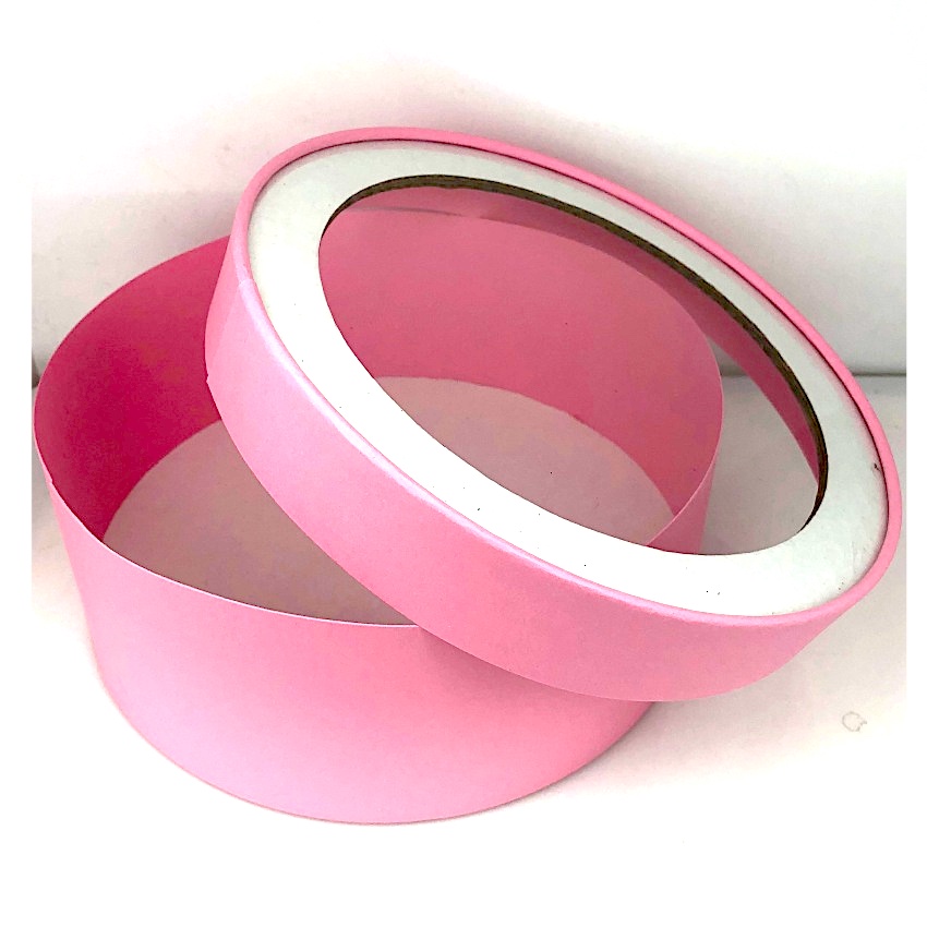 Круглая кондитерская коробка с окном, обычно используется для упаковки десертов, бенто тортов или зефира, сделана из качественного цветного картона. Цвет коробки - нежный розовый.
