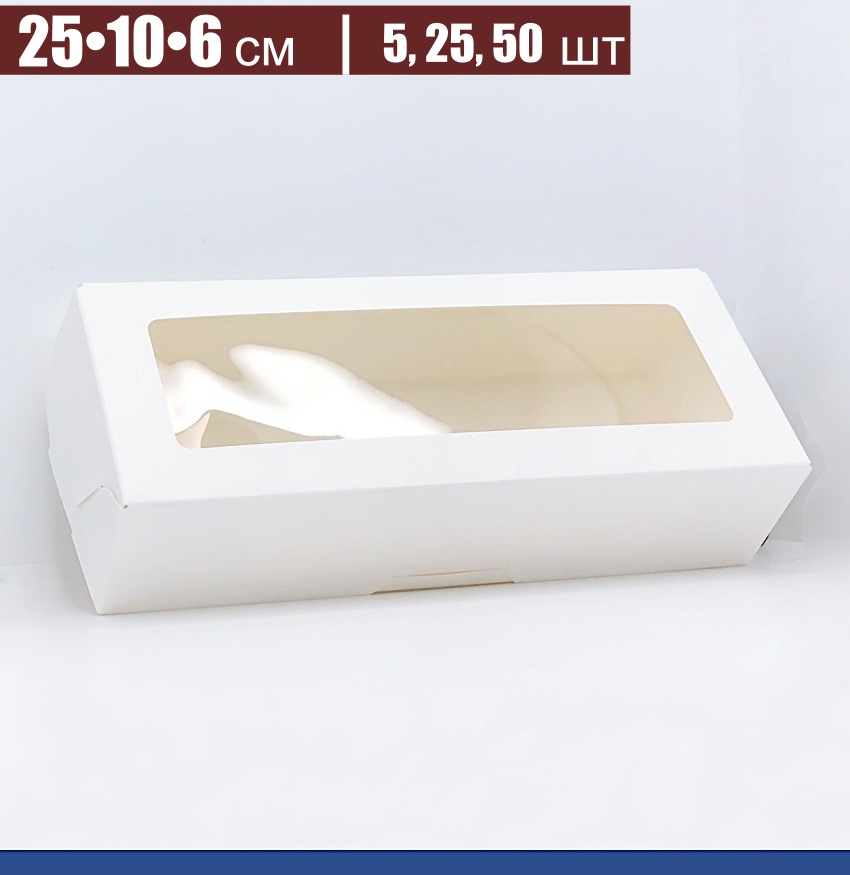 Кондитерская коробка Профи Универсальная 25•10•6 см Белая с окном (сборная) в упаковке 5-50 шт подойдёт для упаковки пряников, шоколада, печенья, зефира, пирожных и других кондитерских изделий высотой до 60 мм. Такую коробку легко купить в интернет магазине с быстрой доставкой. Цена за упаковку. Скидка 5%. Ищите промокод для скидки у нас на сайте!