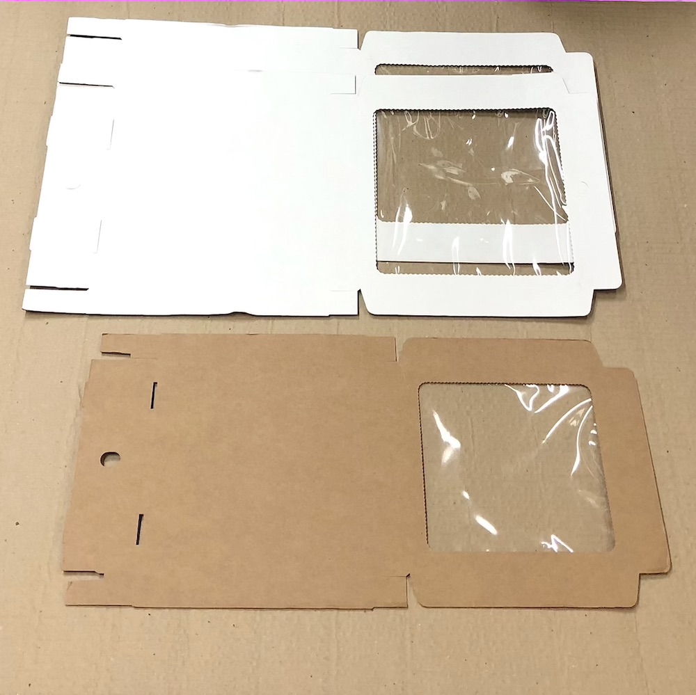 Конструкция: самосборная. Материал тонкий и прочный крафт микрофрокартон, окно из плёнки пвх.