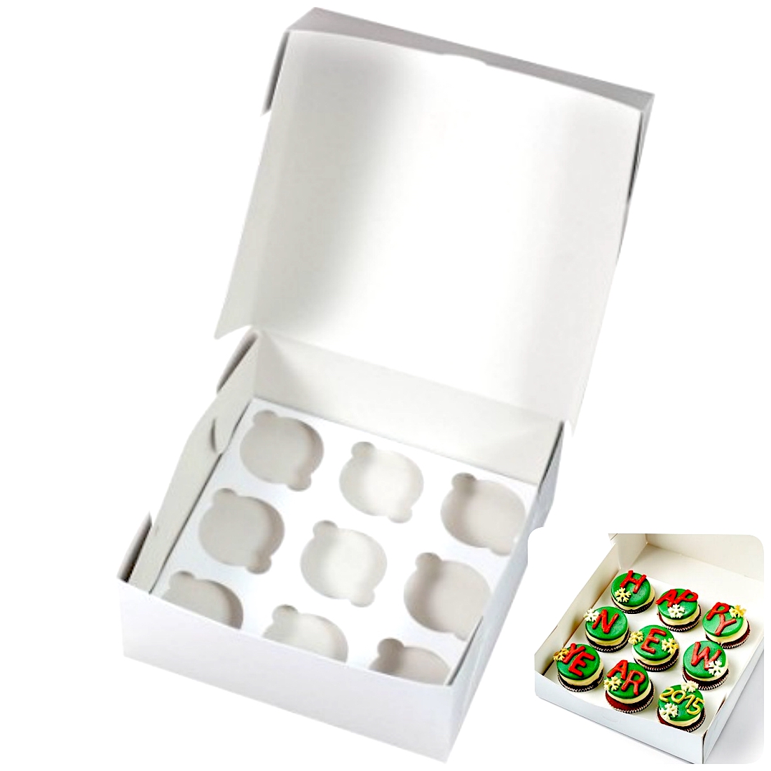 Коробка для упаковки 9 капкейков, размер 250*250*100 мм Состоит из двух частей, коробки и вкладыша для капкейков.