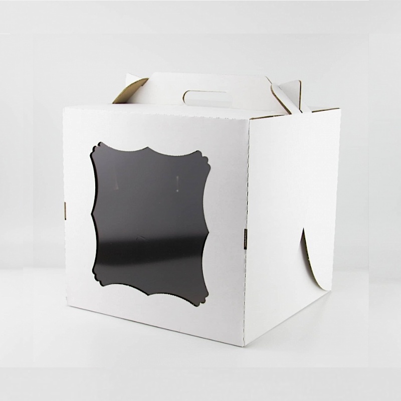 Прозрачные окошки позволяют без проблем заглянуть внутрь. Картонная упаковка предназначена для торта диаметром 20 см и высотой до 20 см.