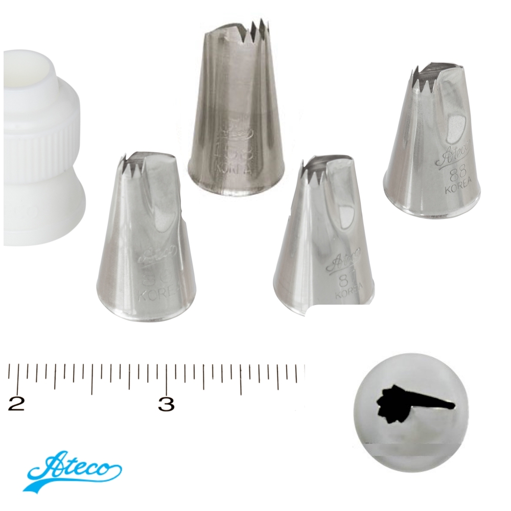 Кондитерские насадки Ateco №86, 87, 88 и 158 - это прямой лепесток с зубчиками, обычно используется как лепесток или для другого декора (бордюры, рюши и т.п.)