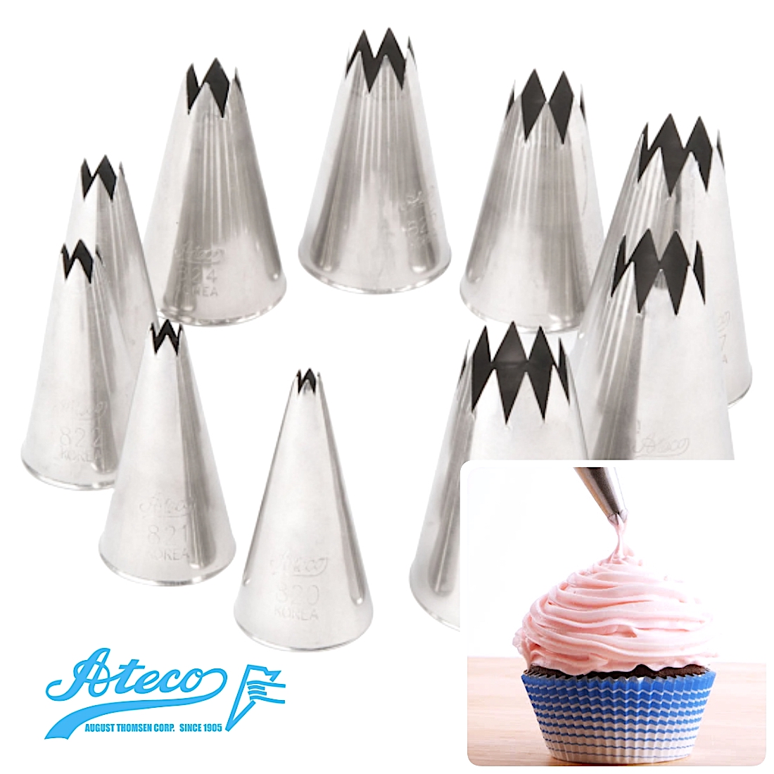 Кондитерские насадки Атеко номера 820, 821, 822, 823, 824, 825, 826, 827, 828 и 829 - это открытые звезды, используются для декорирования выпечки (тортов, капкейков, бискивтов и проч.) розами из крема, шоколада или айсинга, отсаживания теста или создания другого декора (ракушки, бордюры).