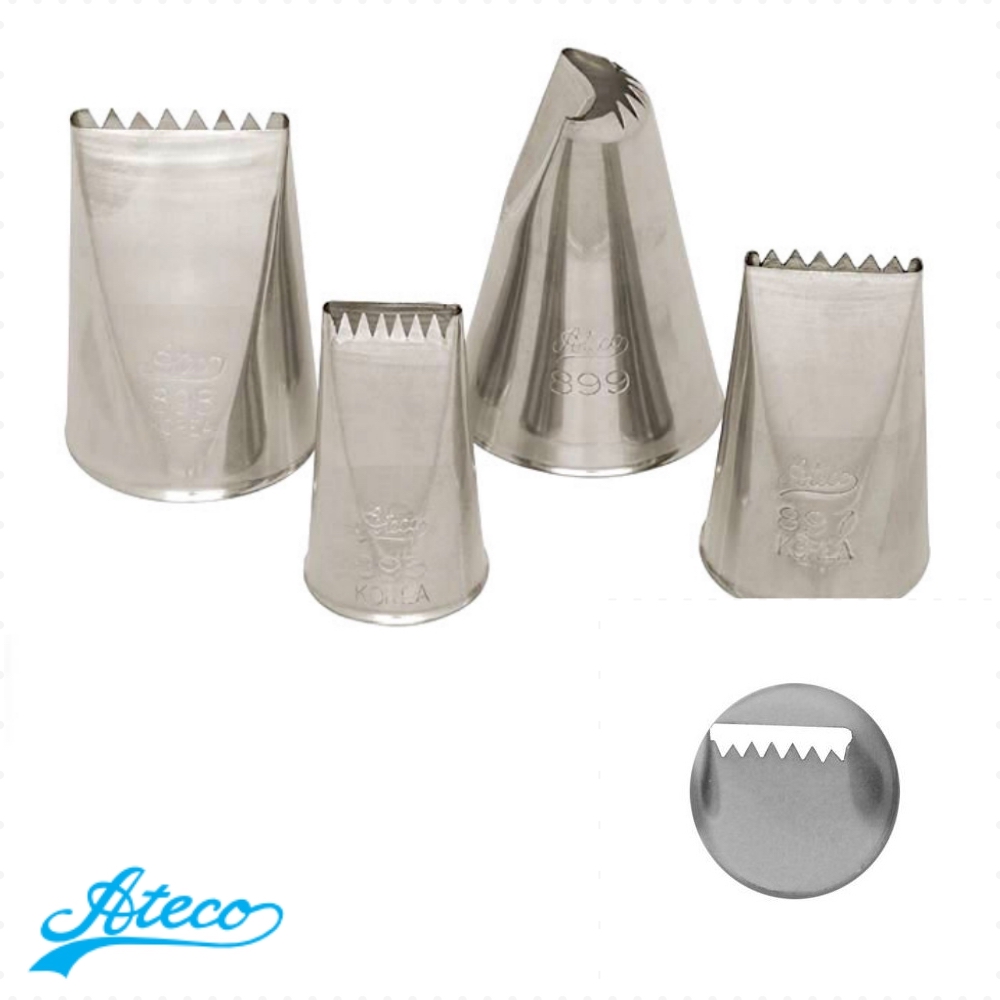 Кондитерские насадки Ateco №895, 897, 898 имеют выходную прорезь прямой формы, №899 - полукруглой формы с зубчиками, подходят для формирования бордюров, лент или другого декора. Обычно используются для формирования корзин.