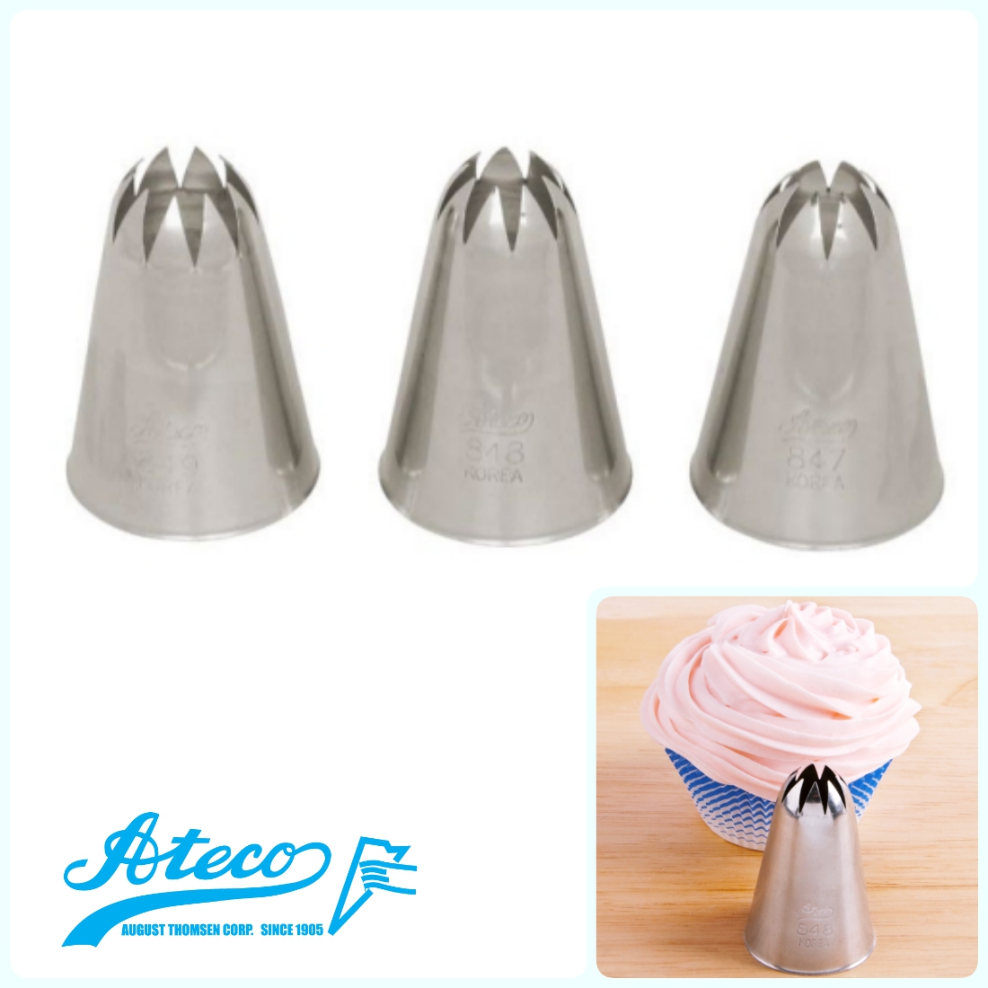 Кондитерские насадки Атеко №№ 844, 845, 846, 847, 848, 849, - это закрытые звёзды, имеют 6, 7, 8, 9 и 10 лучей (зависит от модели), обычно используются для формирования роз из крема, а так же используется для создания бордюров и другого декора.