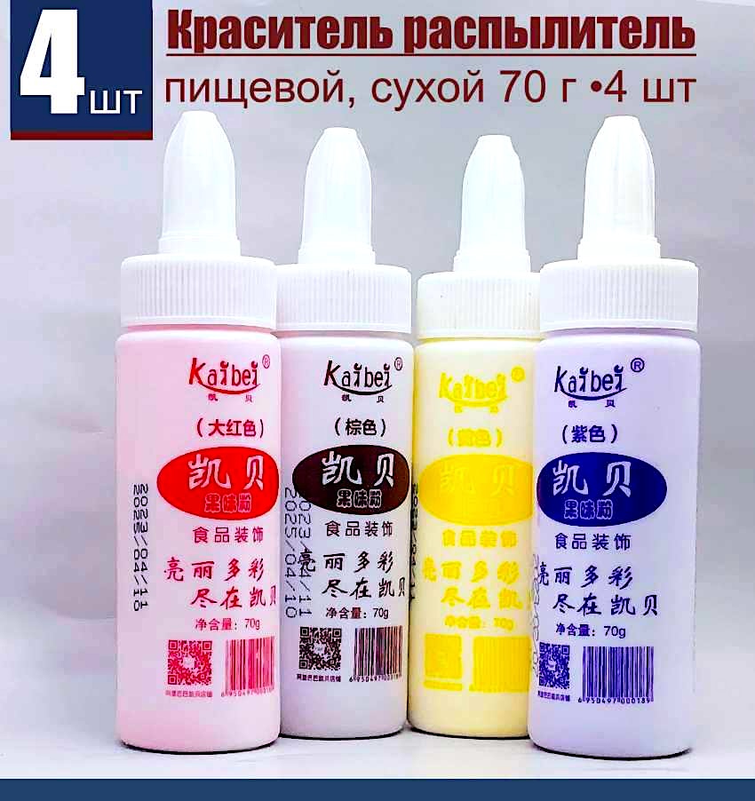 Пищевой краситель распылитель сухой Набор 4 шт•70 г Фруктовая Пудра KAIBEI - купить в интернет магазине. Бережная упаковка. Быстрая доставка. Ищите промокод для скидки у нас на сайте! Распылитель позволит достичь желаемого цвета готового изделия, наносится на любой крем, мастику, шоколад.